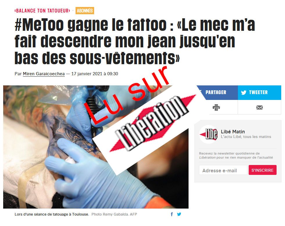 Maître Jean-Bernard BOUCHARD, avocat au Barreau de Paris, répond aux questions du journal Libération dans un reportage intitulé : #MeToo gagne le tattoo : « Le mec m’a fait descendre mon jean jusqu’en bas des sous-vêtements »
